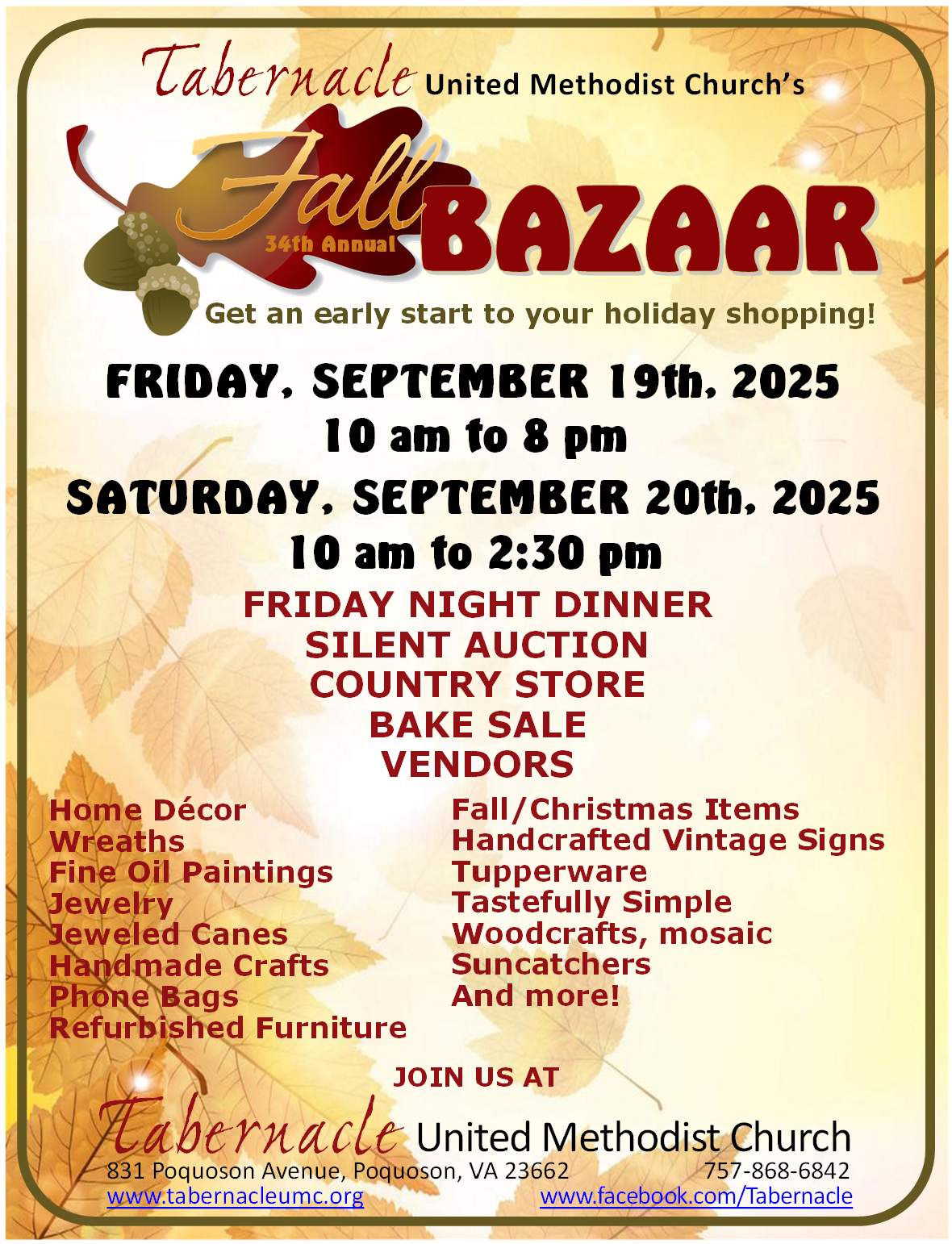 Pam Stagg United Women in Faith Annual Craft and Vendor Show, lunch from 11:00-1:00, and Bake Sale on Saturday, November 1st 9:00 AM - 2:00 PM.
