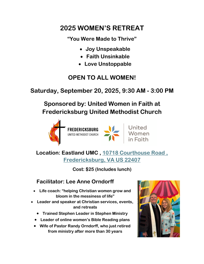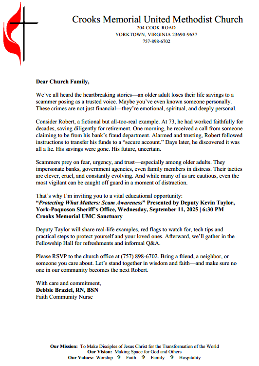 The first of the quadrennial clergy ethics training will be on October 7, 2025, in Virginia Beach. The deadline to register for the October 7th session will be September 11. Please remind folks in your newsletters.