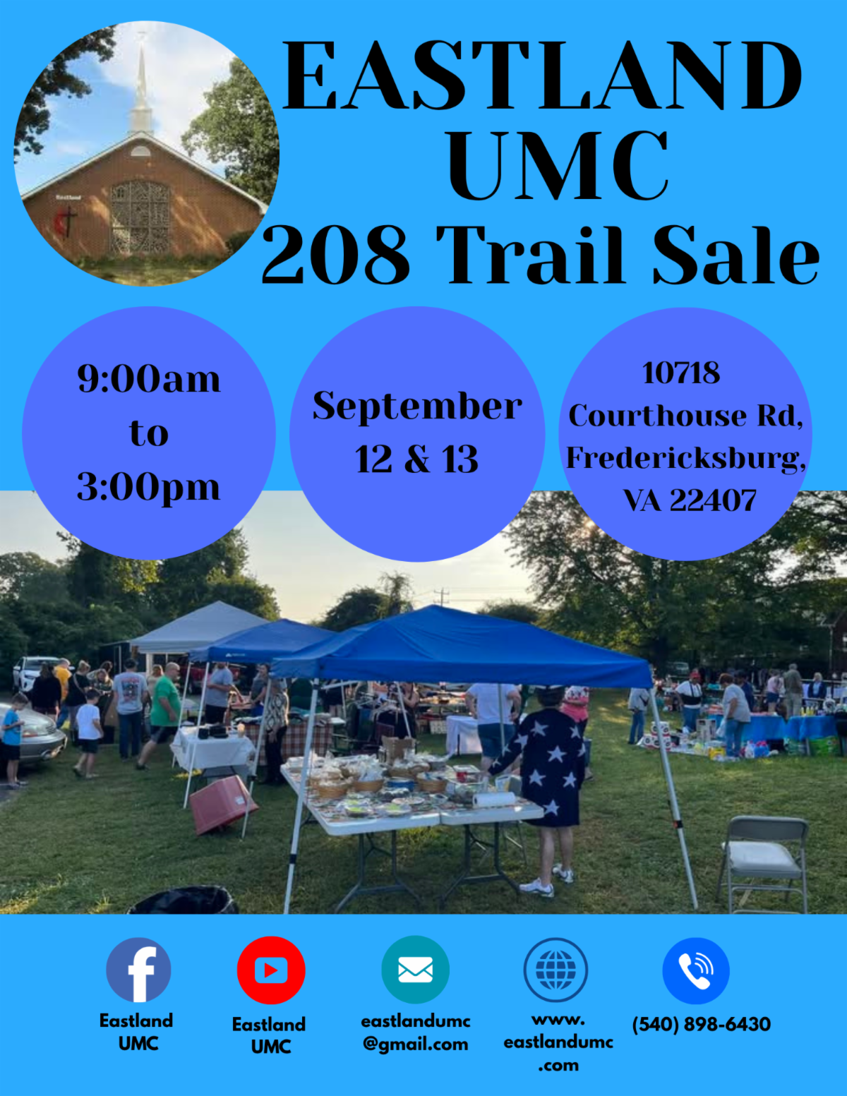 Join us for Eastland United Methodist Church's 70th anniversary held on Sunday, Sept 7, 20225. Worship with communion will be at 10:30 am with a luncheon immediately following in the Fellowship Hall. If you know any past members, family, and friends please invite them. RSVP to eastlandumc@gmail.com or call (540) 898-6430.