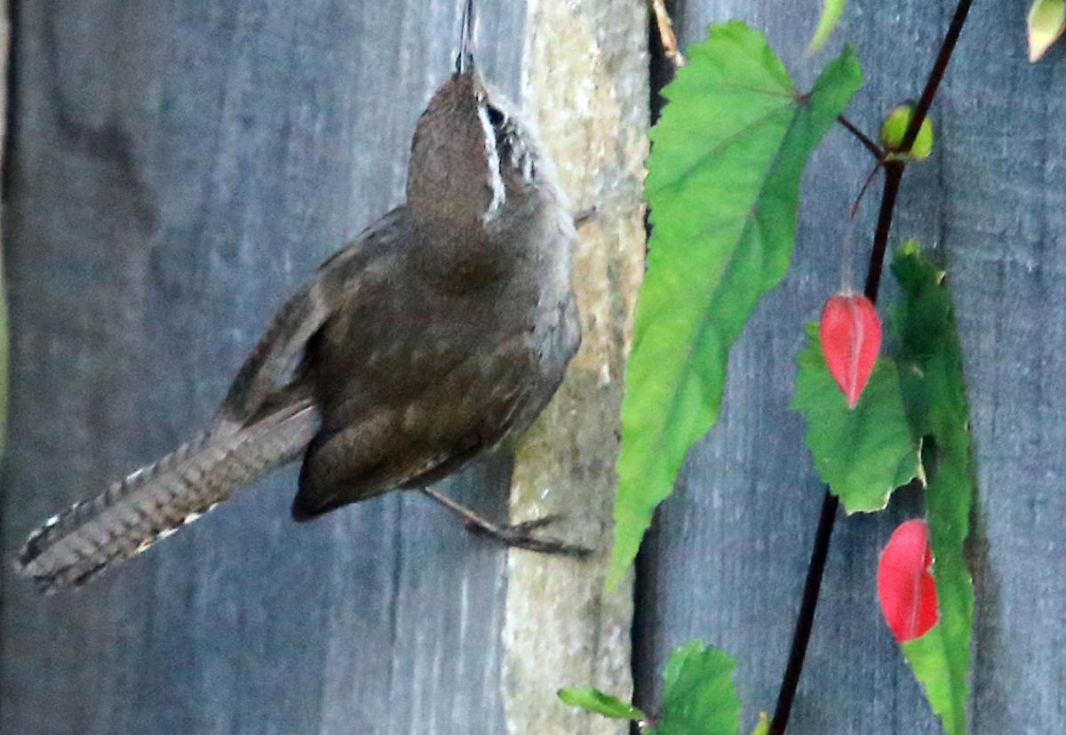 A Bewick's wren clings to a wood fence as it scours a yard in Watsonville for a snack.