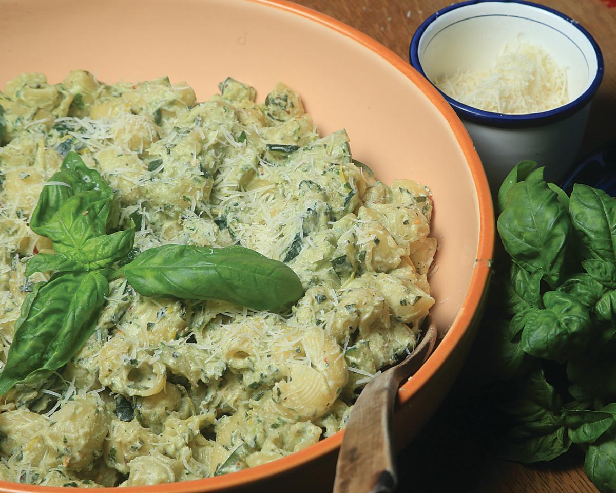 Drain pasta and add to the frying pan with the zucchini and onion. Turn heat to medium high. Add 1/2 cup of the pasta water. Stir in the ricotta cheese, red pepper flakes and lemon zest. Mix thoroughly. Stir in some salt and pepper to taste. The mixture should be very creamy. Add more pasta water if necessary. Finally, stir in the basil paste and half of the grated cheese. Mix well and serve with the remaining cheese and chopped nuts on the top. Serves about 6.