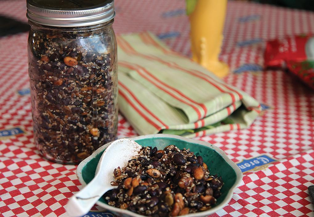 I have been keeping a jar of these beans as a staple in my refrigerator for the last few months, remaking them as I run out. Whenever I need a small snack or a topping for a salad, this little sweet mix of beans, nuts and seeds adds a new dimension of flavor and a protein-filled complement. It also goes great with barbecued meat.