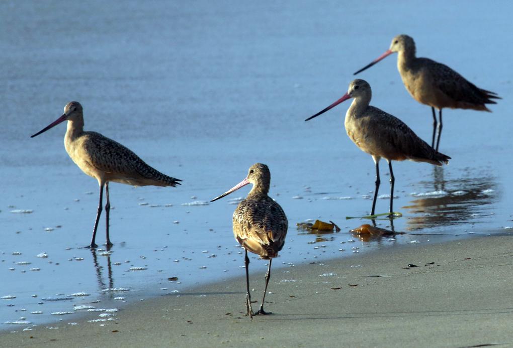 Marbled godwits work the shoreline in Moss Landing.