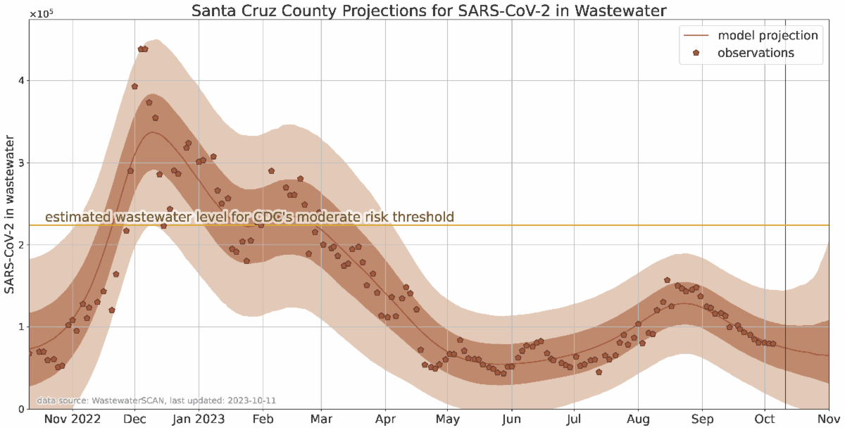 The second graph below shows data that the Health Department collects for Covid from wastewater at the City Influent, for the city of Santa Cruz, and from the Lode Street pump stations for the county. This graph shows wastewater level to be below Center for Disease Control's moderate risk threshold.