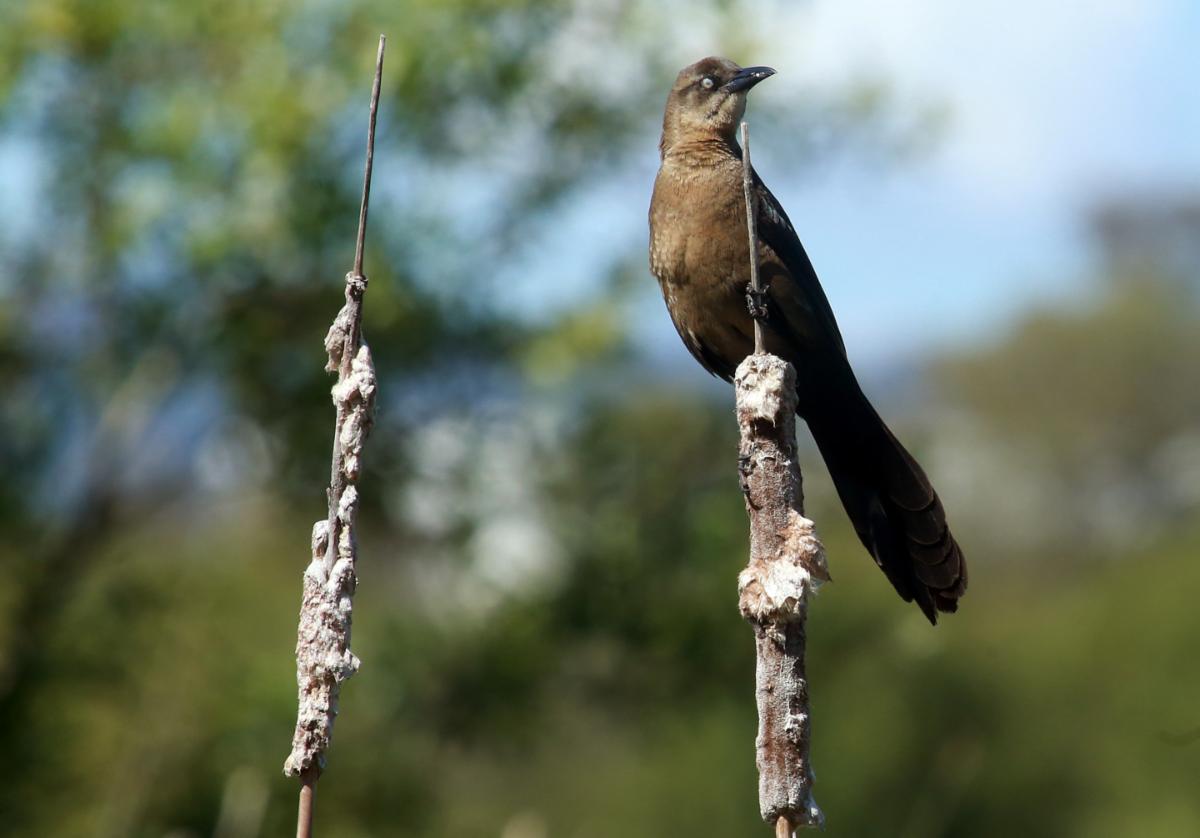 A female great-tailed grackel perches on a decaying cattail at Pinto Lake County Park in the Pajaro Valley.