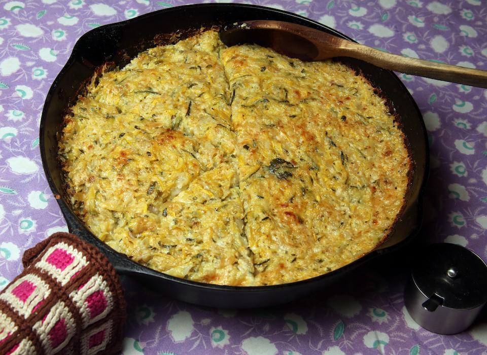 Although this dish is simple, it does take a little while during which you will get to learn how much water is in two pounds of zucchini. The dish can also be made in advanced and baked later.