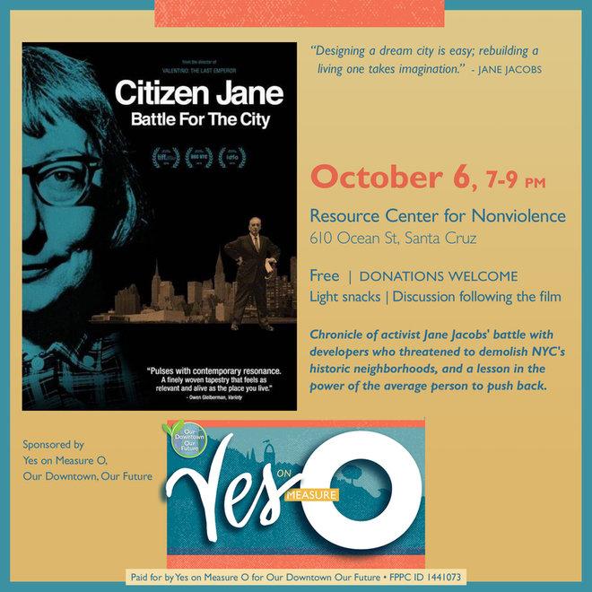 Citizen Jane Jacobs who defeated famous New York developer Robert Moses will be in Santa Cruz, Oct. 6 at 7pm at the Resource Center for Nonviolence, 612 Ocean St. in Santa Cruz. Suggested donation $15.