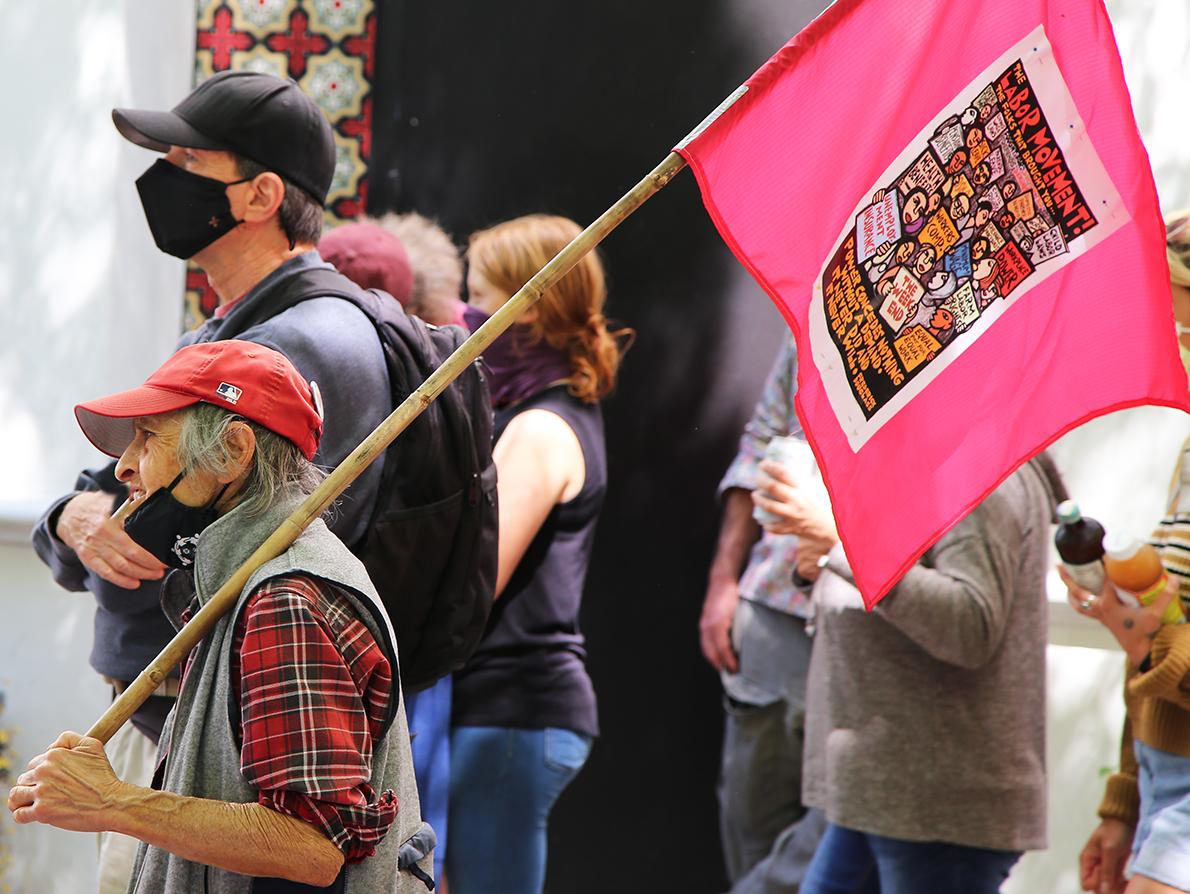 Jean Piraino, in the foreground with the red flag, is a long time supporter of the Monterey Bay Area's labor movement. Here she is on May Day 2021 in downtown Santa Cruz.