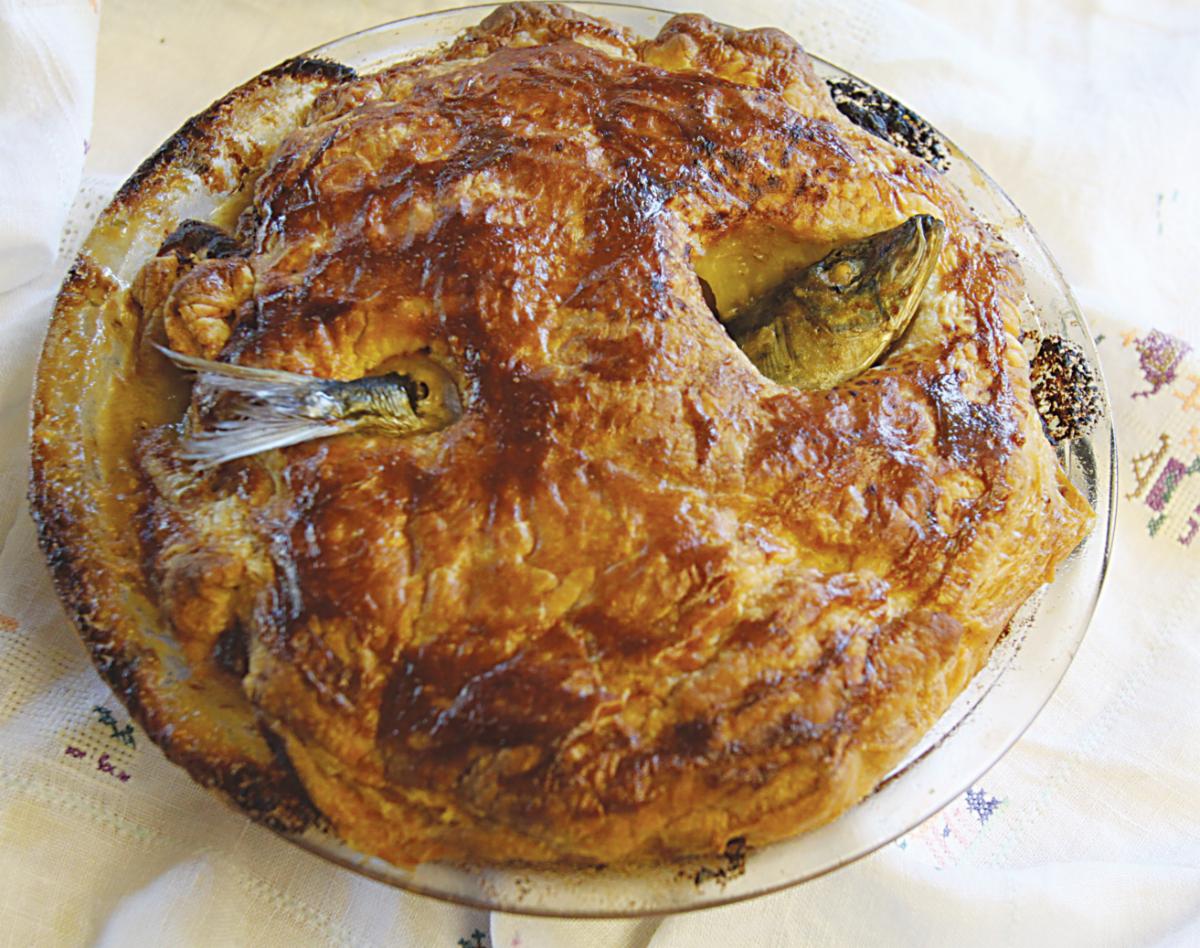 Pour the cooled sauce over the fish. Roll out the puff pastry so that it can fit over the pie pan. Place it over the pie pan and trim to fit. Make two slits in the pastry and insert the head in one and the tail in the other. Brush the top with the beaten egg and bake for 40 to 50 minutes. Serve with green vegetables or a salad. Serves about four.