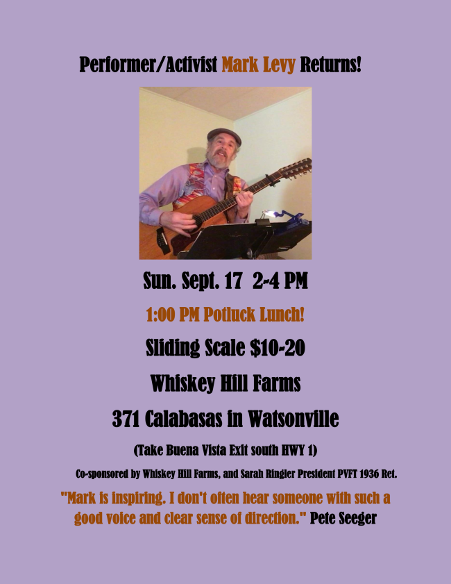 The concert starts at 2pm but bring some food and join the potluck at 1pm. See the poster below. For information on Mark, click HERE. For information on the event, email HERE.