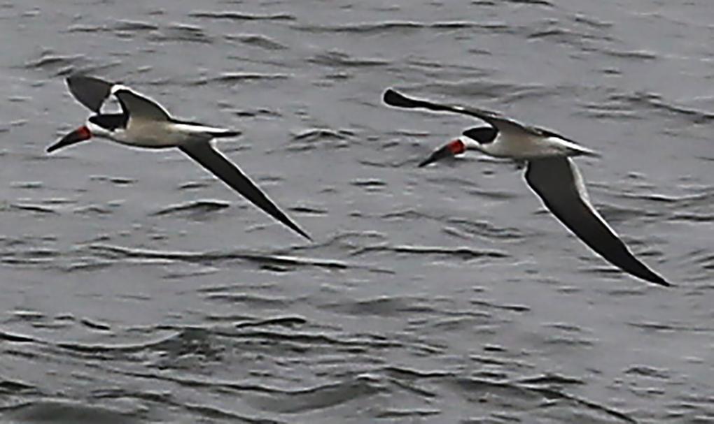 Black Skimmers are flying around the Monterey Bay foraging by dipping their beaks into the water and scooping up food. On the Atlantic coast, they're returning from near extinction from the commercial harvesting of their eggs and feathers in the late 19th century.