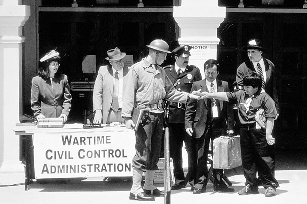 The photo, above, is from “Liberty Lost … Lessons in Loyalty,” a reenactment held on Apr. 28, 2002 in Watsonville at the Veterans Memorial Building. The event marked the 60th anniversary of when 725 local citizens of Japanese ancestry were evacuated from the Pacific Coast. In the photo, Cub Scout Brandon Shimizu is portraying Norm Mineta. The soldier is Randall Sparling. Rev. Shousei Hanayama, portraying Norm’s father, said, “Shikataganai, Norman. It can’t be helped.” Others (L-R) are: Jeanette Otsuji Hager and Hank Cardona of WCCA, Police Chief Peter Chelemedos, and reporter J. P. Johnson.