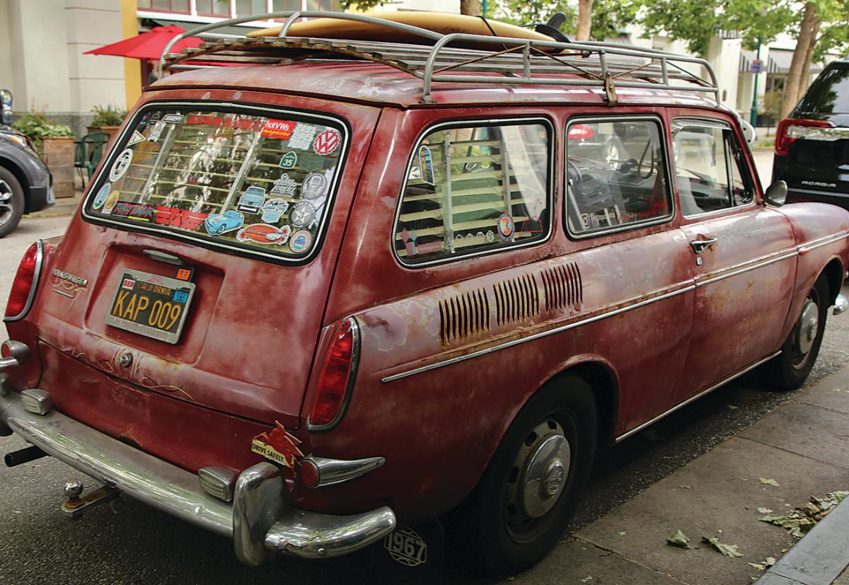Fashion Street - A VW squareback, made from from 1961 to 1973, is equipped with Venetian blinds, surfracks, gobs of stickers and plenty of dents on Pacific Avenue in downtown Santa Cruz.