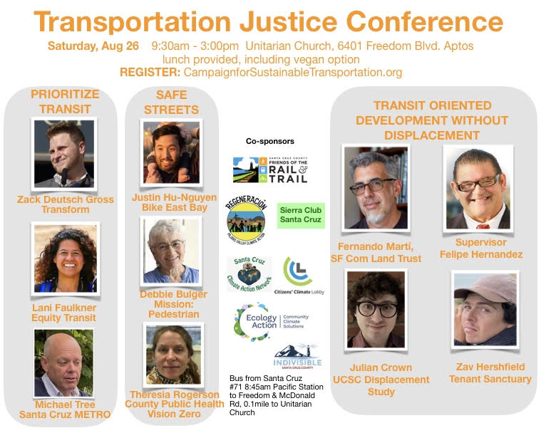 Transportation Justice Conference - Aug, 26, 9:30-3pm, Unitarian Church, 6401 Freedom Blvd., Aptos. Lunch will be provided. Register HERE.