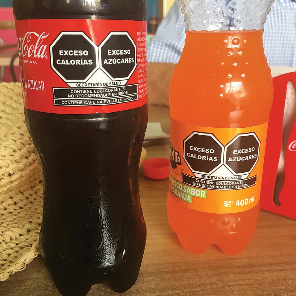 In 2020, Mexico enacted a law that required informational labels on products that alert customers about health hazards. Here are labels on Coca Cola and Fanta that warn of excessive calories and sugar.