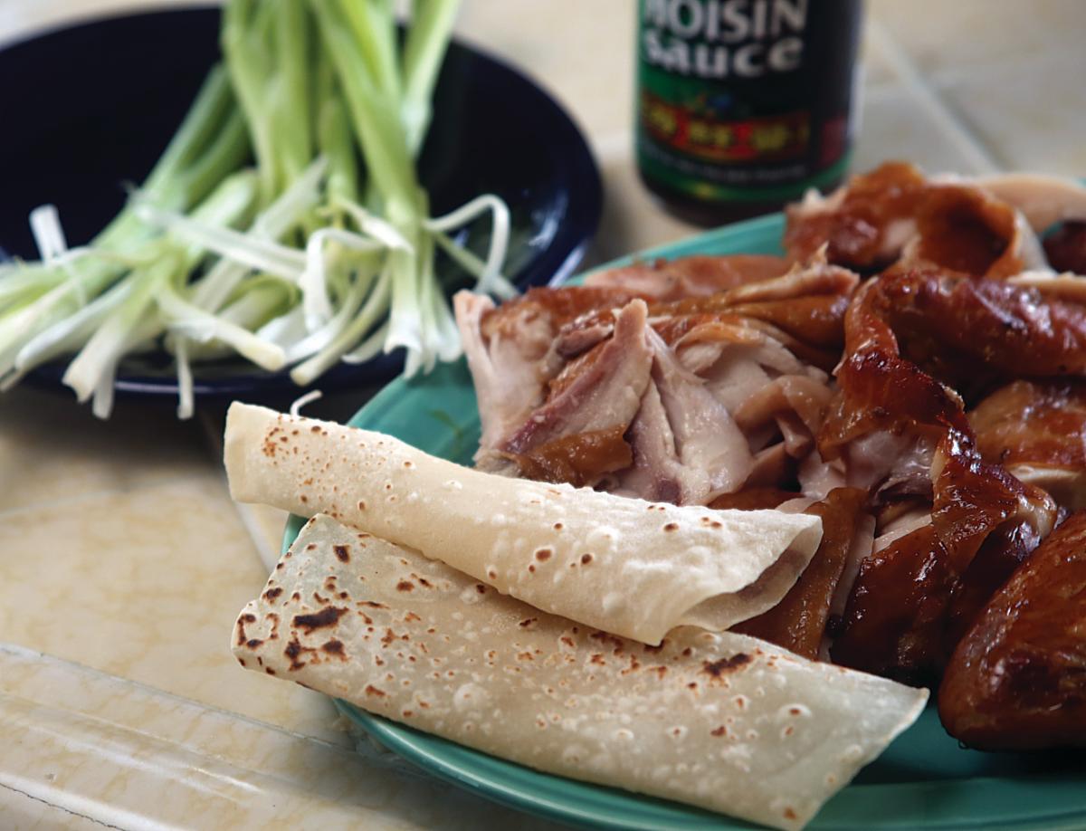 Serve warm with the green onion brushes, hoisin sauce and Mandarin pancakes or small flour tortillas. Serves 4-6.