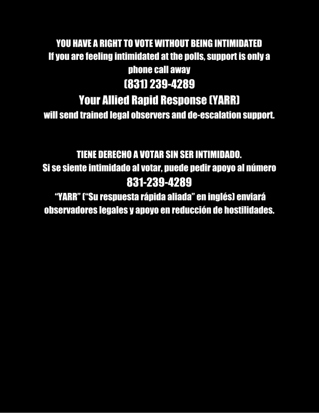 To help support the election process, YARR is reaching out to the Santa Cruz community to make sure that everyone knows that our responders who are trained in legal observation and de-escalation, will be available if there are any cases of voter intimidation at polling places in the county. Please be sure to spread the message and the hotline number, 831-239-4289, among your circles.