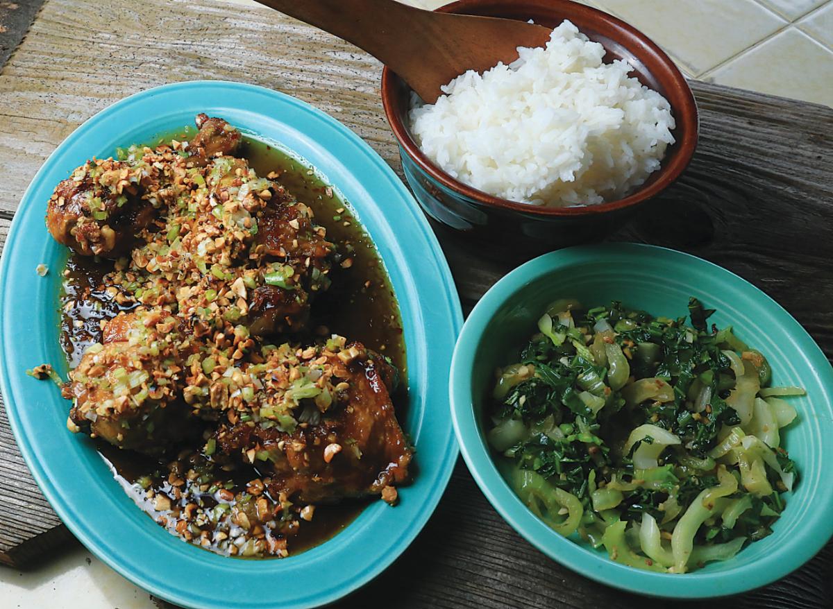 Put the cooked chicken parts in the bowl with the shallot-mirin sauce and toss to coat. Then add each chicken part to the bowl with peanuts and green onions. Roll to coat. Put in a serving bowl and drizzle with the honey ginger sauce. Serve with rice and greens.