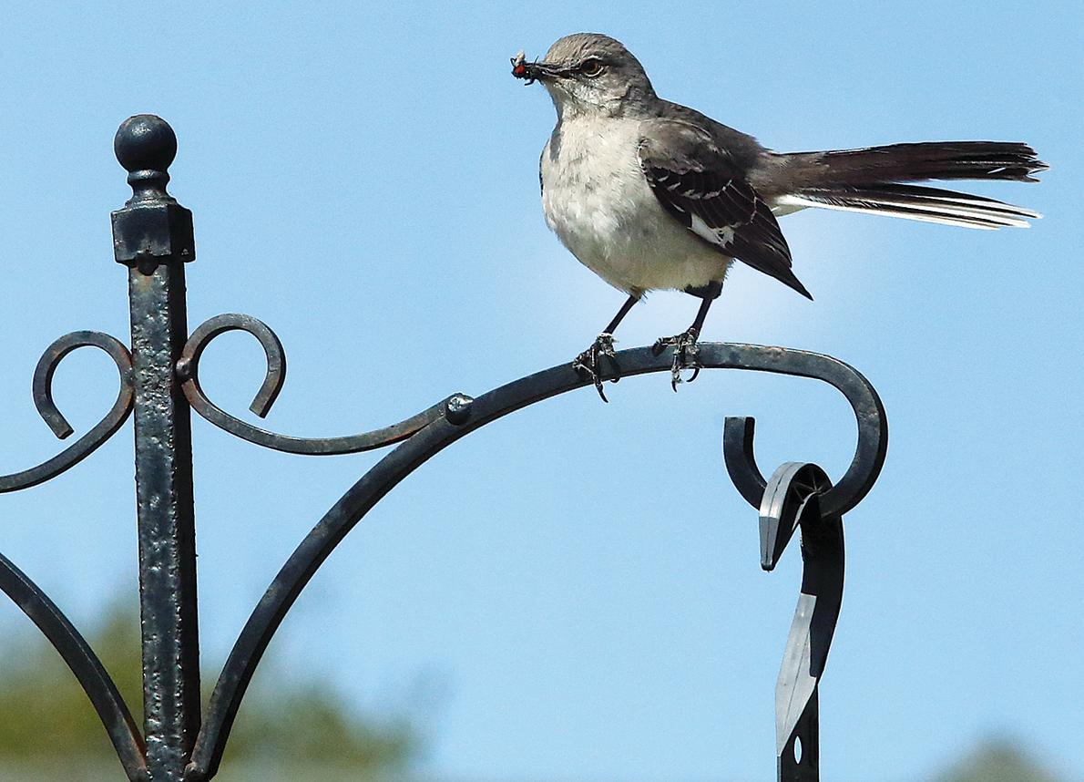 A northern mockingbird rests on a plantstand while building a nest in a nearby pine tree.