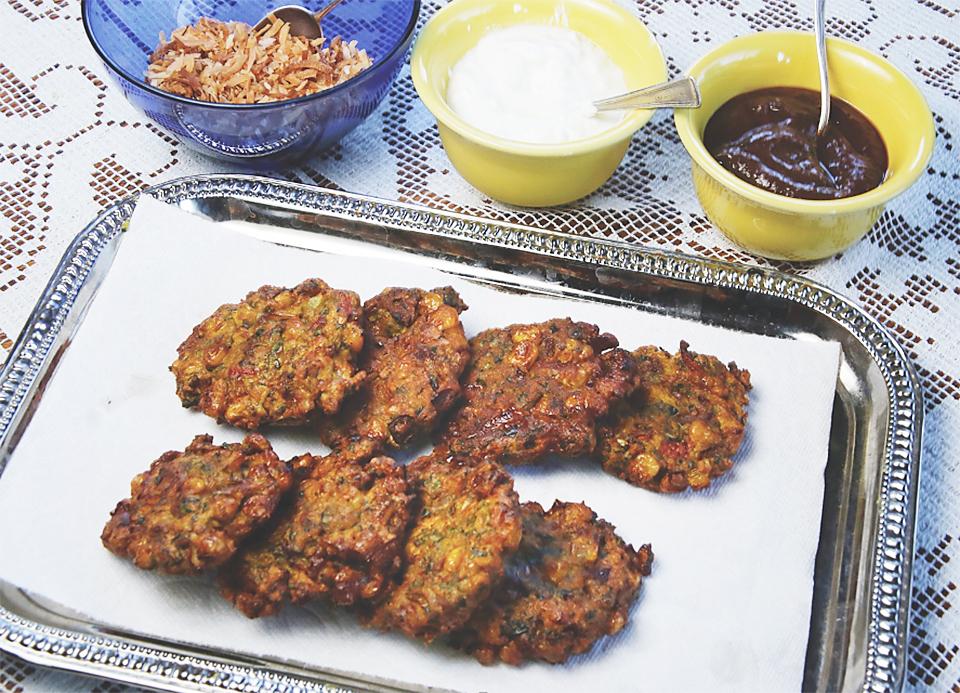 You have a full flavor and texture palette when you add chutney to these crispy, fried, spicy patties. The recipe is from Niven Patel, originally from Surat, India, who operates a farm called Rancho Patel near Homestead, Florida that he uses to supply his restaurant Ghee. His recipe calls for Lacinato kale, usually available around here from Lakeside Organics, but any kale variety will work.