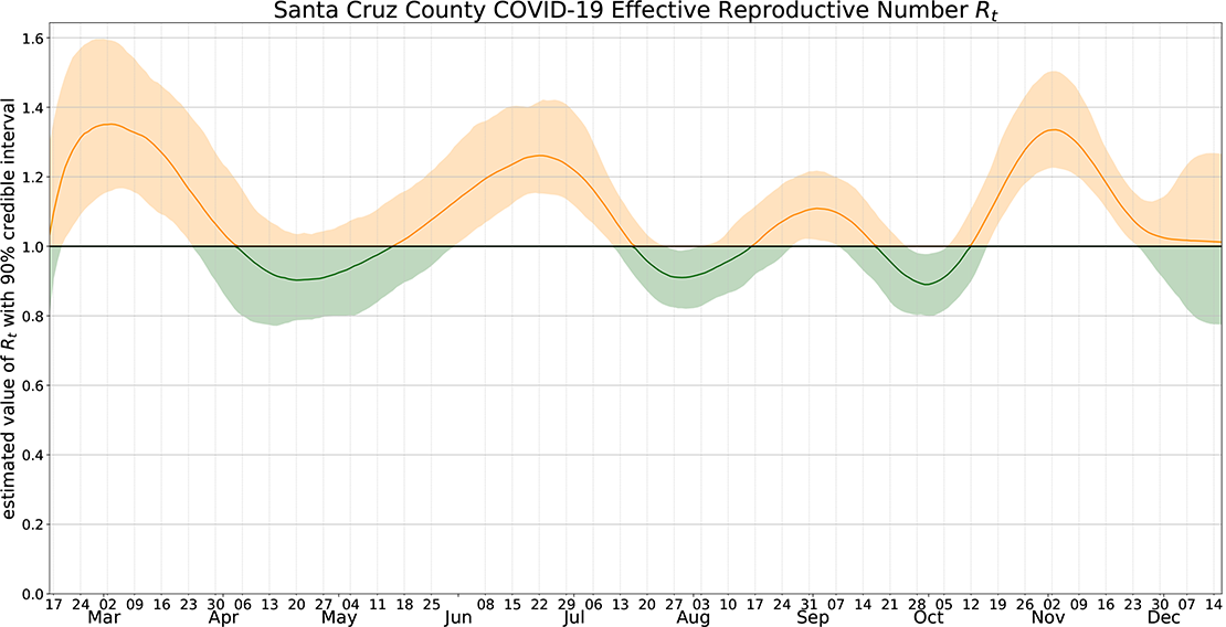 The data distribution has remained mostly stable over time with percentages rarely changing by more than one percentage point. The county's Effective Reproductive Number continues to be above one. See chart below which is continually updated. Numbers above one show the spread of the virus is increasing. Below one means the spread is decreasing.