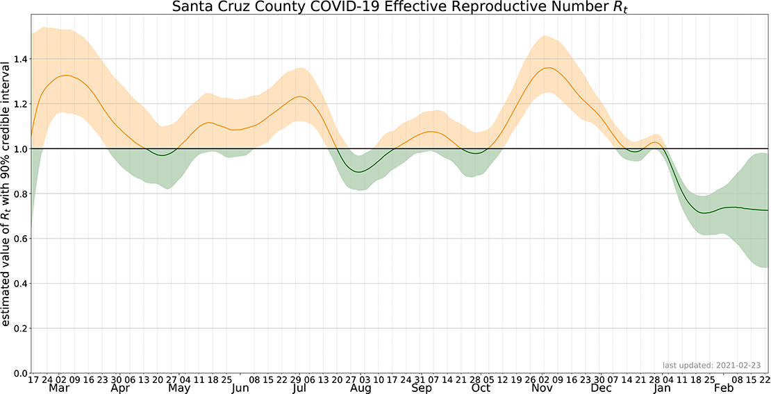 The county's Effective Reproductive Number is continuing to fall below one. See chart below. Numbers above one show the spread of the virus is increasing. Below one means the spread is decreasing.