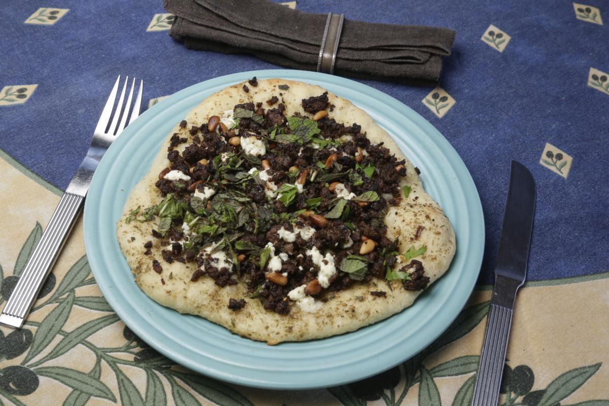 Flatbreads are usually made with only flour, water and salt. Pizza is a kind of flatbread but the crust is made with yeast and is usually associated with Italy so this recipe is a flatbread pizza I suppose. It is inspired by David Tanis of the New York Times who ate this Lebanese treat on the streets of Paris. This crust is not thin or thick but full of airy spaces that cushion the topping providing a nice chewy base to the blanket of herbs and spices, crunchy meat, creamy feta cheese and pine nuts.