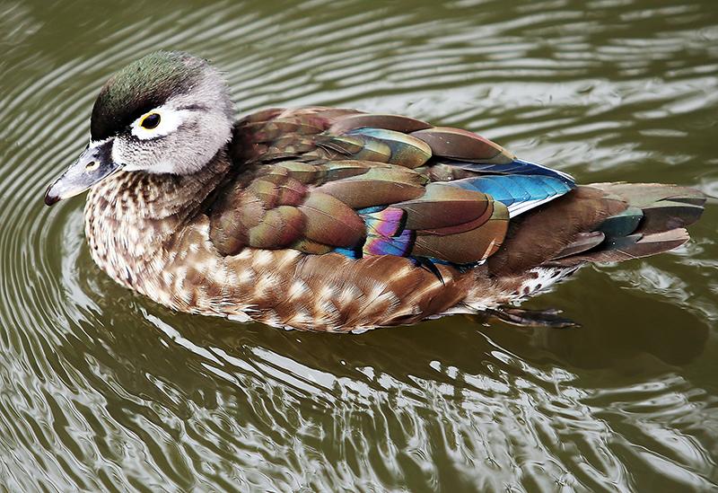 A wood duck hen cruises the waters of Neary Lagoon in Santa Cruz. Wood ducks are here year round.