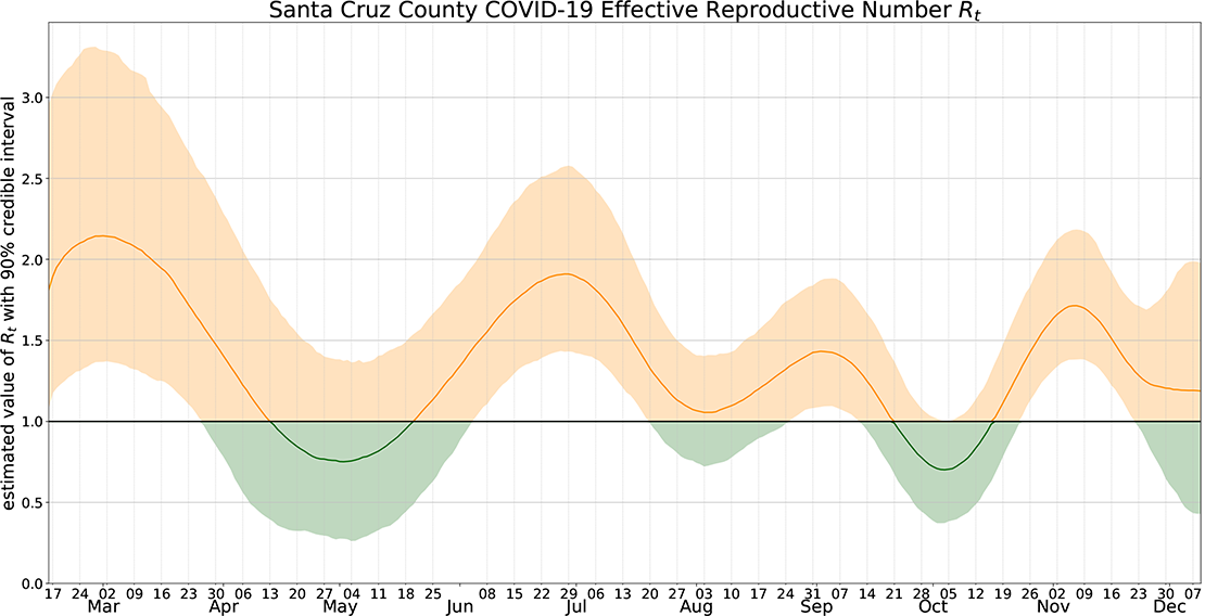 The distribution of the data has remained mostly stable over time. The county's Effective Reproductive Number continues to be above one but is dropping from last week. See chart below. Numbers above one show the spread of the virus is increasing. Below one means the spread is decreasing.