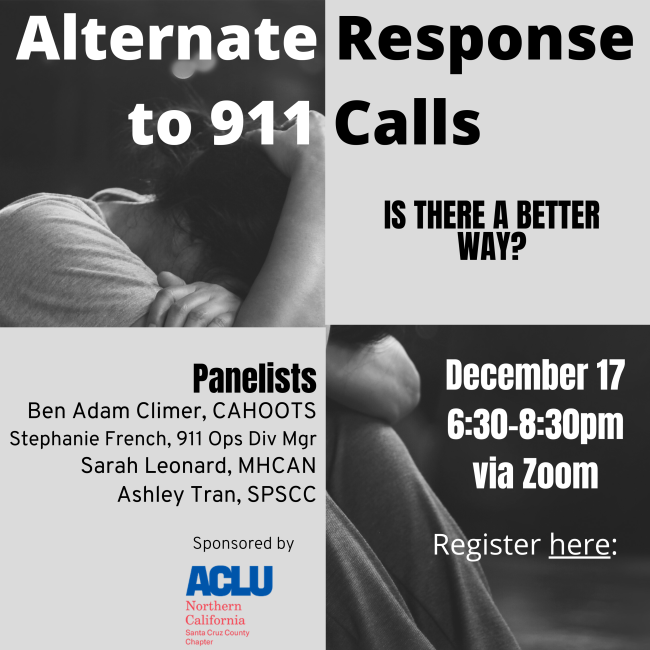 The Santa Cruz County Chapter of the ACLU of Northern California is pleased to announce an educational webinar on an alternative response to 911 calls on Dec. 17, 6:30-8:30 on Zoom. Law enforcement leaders and activists agree that many non-violent calls should be responded to by trained mental health and social worker professionals, instead of law enforcement officers. This webinar is designed to educate the public about the need and possibility for change and to move the county closer to making that change.