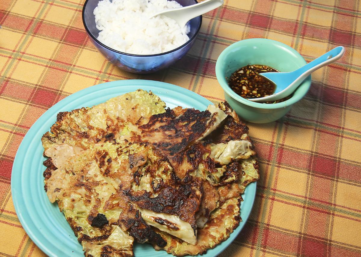 Humorously, each pancake is one leaf of cabbage that has been dragged through a batter and fried until crisp. Spoon on a little vinegary sauce and eat. It’s pretty easy and very satisfying.