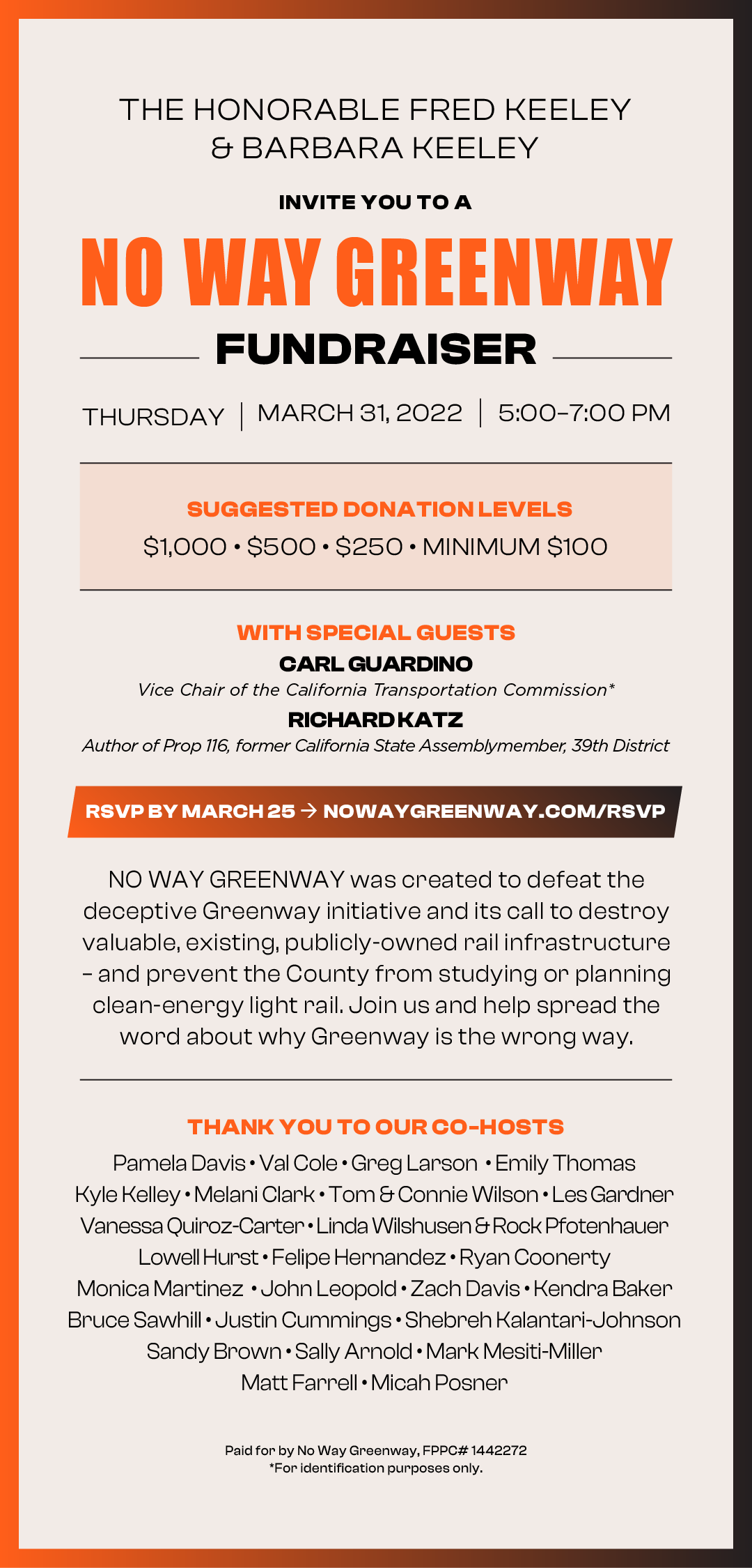 The Friends of the Rail & Trail is pleased to pass along an invitation from the No Way Greenway Campaign inviting all rail and trail supporters to attend a Titans of Transportation fundraiser, hosted by the honorable Fred Keeley. Fred has served the Central Coast for decades, as a supervisor, assembly member, treasurer and environmental leader, and is just one example of the the large, diverse community coalition that supports the No Way Greenway Campaign.