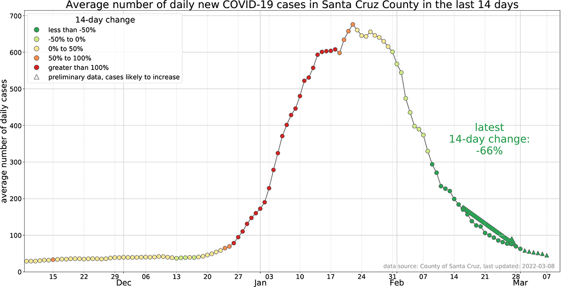 The Santa Cruz County Health Department regularly releases data on the current status of Covid-19 in the county. Total known cases as of March 10 were 47,006, up 1% from last week's 46,443. There was one new death.