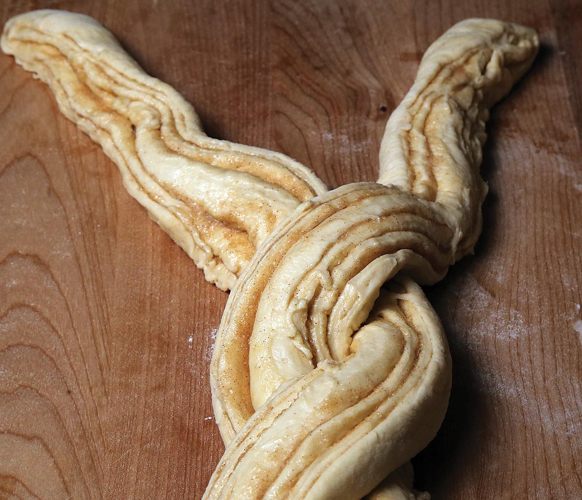 Take the rolled rope of dough that has been cut in half the long way and twist the two halves around each other as seen on the right. Then coil the braid into a tight circle in a cake pan and bake.>