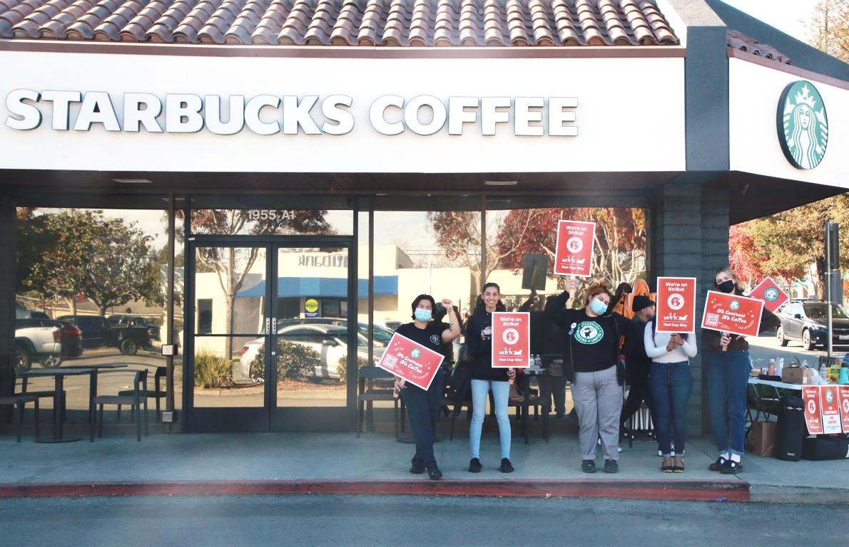 Workers at Starbuck's staged a work stoppage outside the 41st Ave. location in Capitola on Thursday. They were part of a nationwide movement of unionized stores that are protesting the company's refusal to bargain a contract.