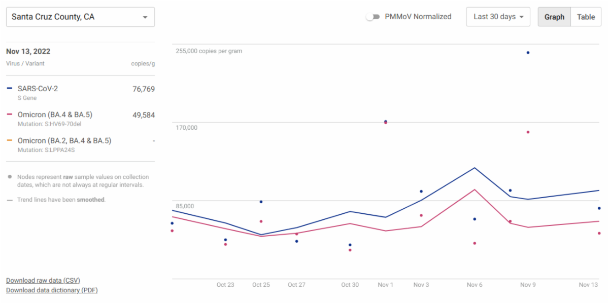Because of the availability of home testing I don't report on changes in the active cases in the county. The Health Department is now collecting data for Covid and monkeypox from wastewater at the City Influent for the city of Santa Cruz, and from the Lode Street pump stations for the county. See webpage HERE. The first chart below shows the latest county data.