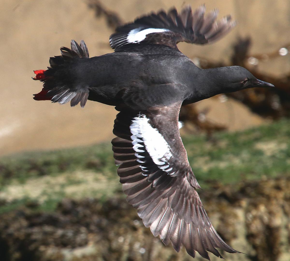 A pigeon guillemot darts out from a cliff along West Cliff Drive in Santa Cruz.