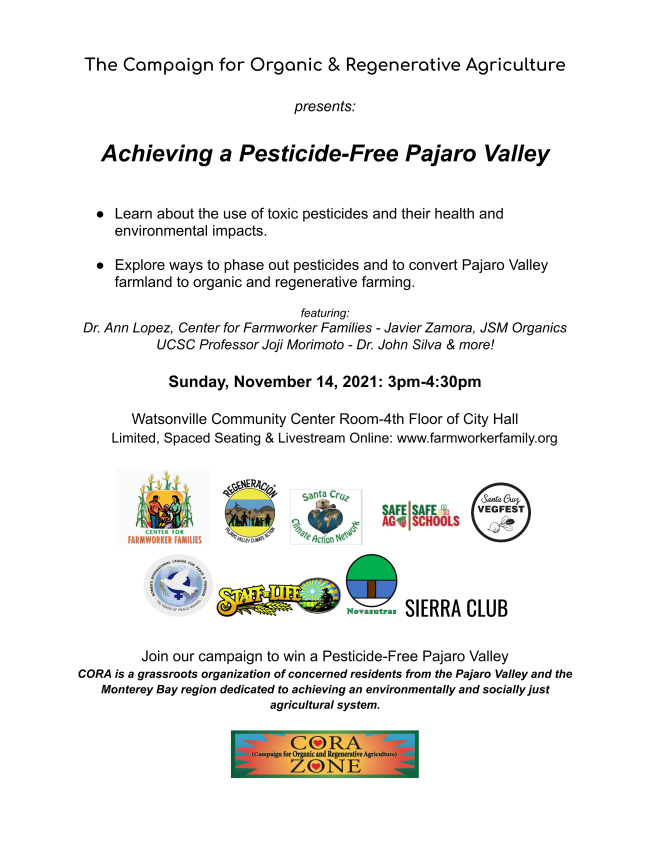 The Campaign for Organic and Regenerative Agriculture(CORA), is organizing an informational forum on the use of toxic pesticides in the Pajaro Valley. The forum will feature speakers with expertise on where harmful pesticides are sprayed, and on the health and environmental impacts. Speakers will also discuss possible challenges and explore opportunities in transitioning Pajaro Valley farmland to organic methods that help, rather than harm our workers, neighbors, and the local and planetary ecosystems.