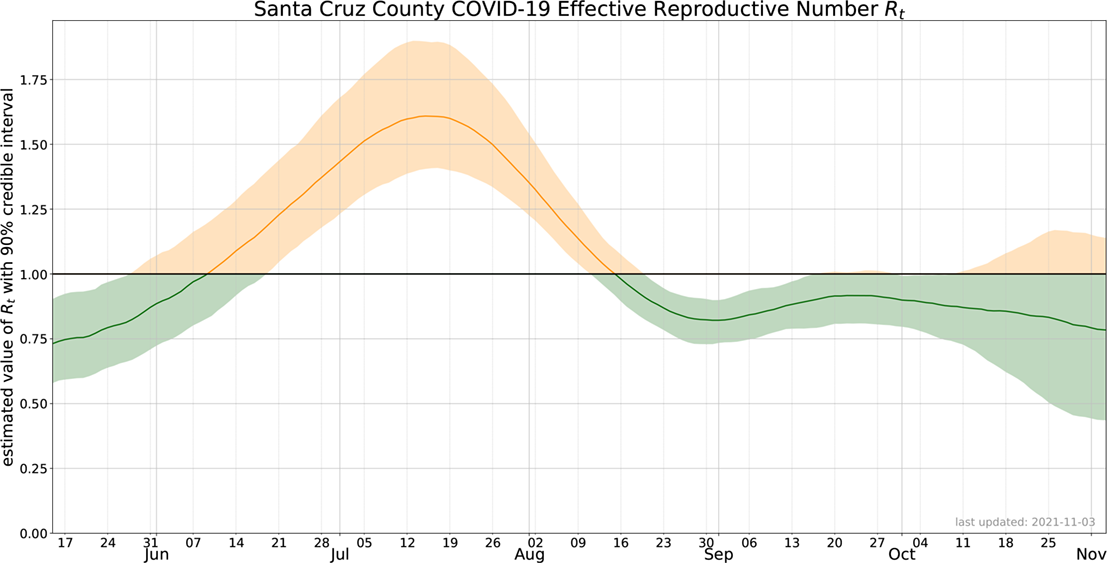 The county's Effective Reproductive Number is below one. See chart below. Numbers above one show the spread of the virus is increasing. Below one means the spread is decreasing.
