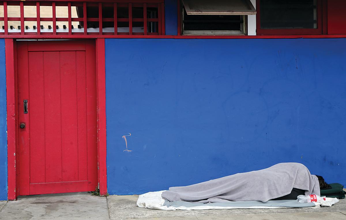A man sleeps on the sidewalk outside the American Legion in Watsonville.
