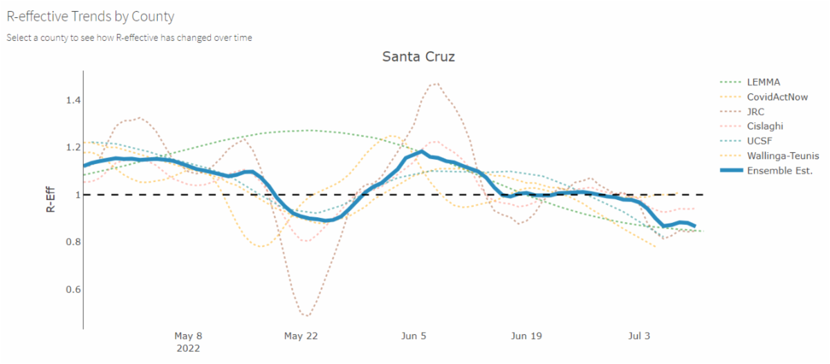The county's Effective Reproductive Number is now below one. See chart below. Numbers above one show the spread of the virus is increasing. Below one means the spread is decreasing. The chart, released from the California Department of Public Health below shows several predictions from different agencies. For more information, click here.