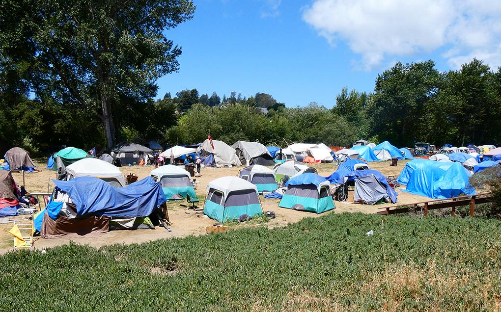 Tent housing on the benchlands of the San Lorenzo River in Santa Cruz.