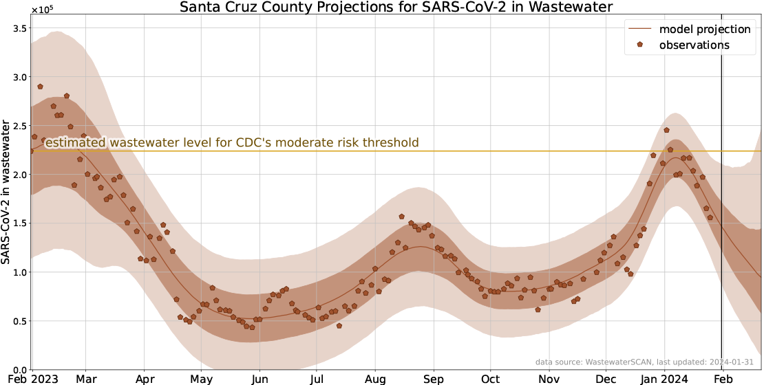 The second graph below shows data that the Health Department collects for Covid from wastewater at the City Influent, for the city of Santa Cruz, and from the Lode Street pump stations for the county.
