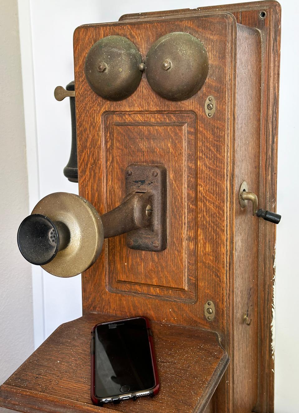 A 1907 Magneto Wall Set made by Bell System, used here as a stand for a, iPhone 6s - also almost an antique - is part of the Hannula family legacy gained from years of his parents' thrift store and yard sale shopping in Pacific Beach (San Diego) in the 1970s.