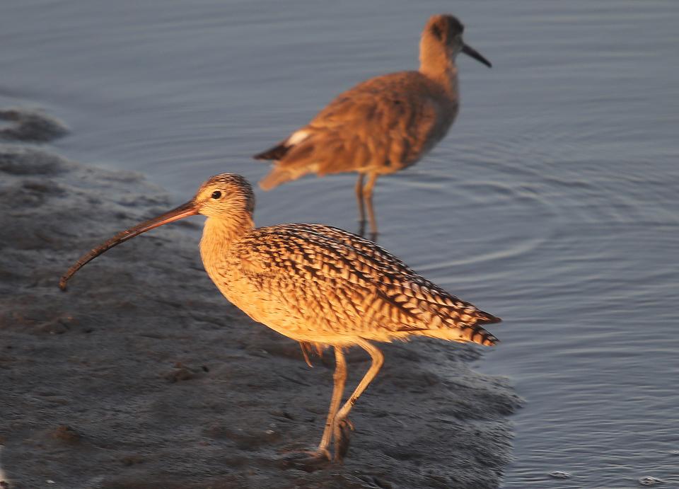 A long-billed curlew works the shoreline at the Moss Landing Harbor.