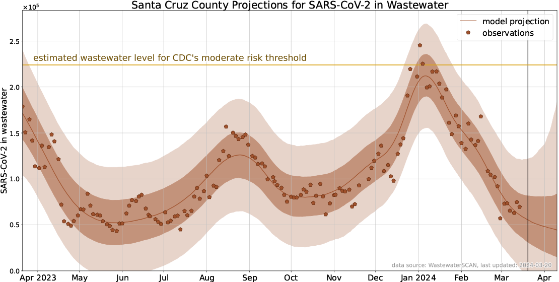 The third graph below shows data that the Health Department collects for Covid from wastewater at the City Influent, for the city of Santa Cruz, and from the Lode Street pump stations for the county.