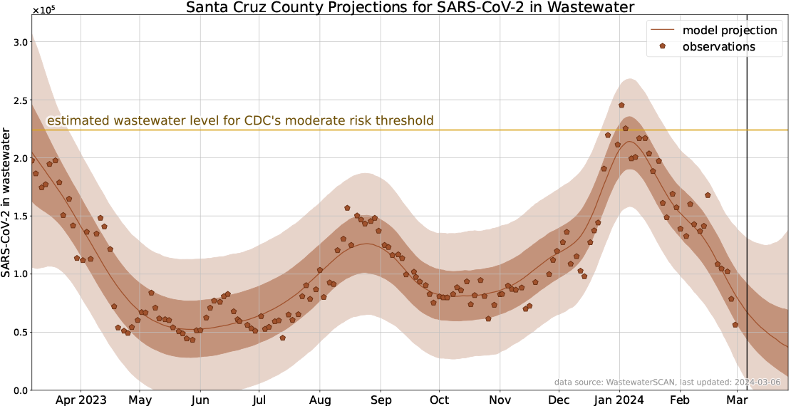 The third graph below shows data that the Health Department collects for Covid from wastewater at the City Influent, for the city of Santa Cruz, and from the Lode Street pump stations for the county.