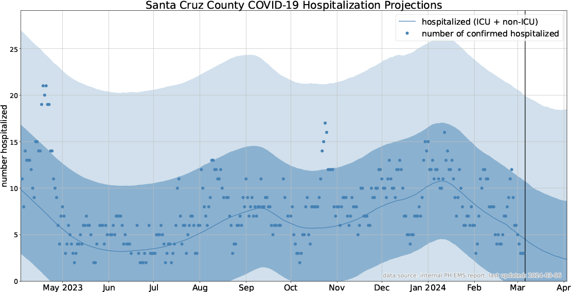 The California Department of Public Health and Santa Cruz County Health Department regularly release data on the current status of Covid-19 in the county as well as information on influenza, Respiratory Syncytial Virus (RSV), and Mpox. Since cases of Covid are still appearing, and there are still vulnerable people, I will continue reporting the graphs below.