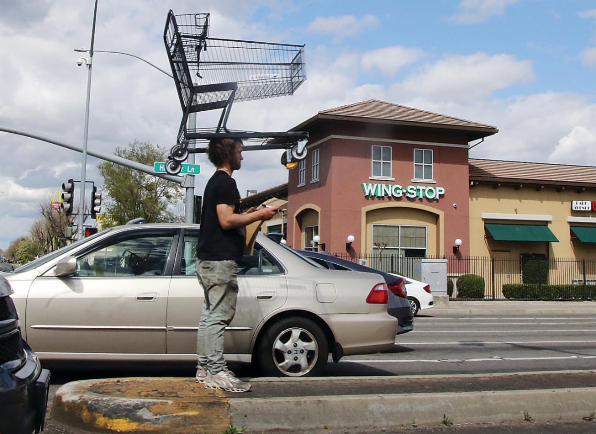Fashion Street - While balancing a shopping cart on his head, this man flashes a handmade sign asking for money on a traffic island somewhere near Sacramento