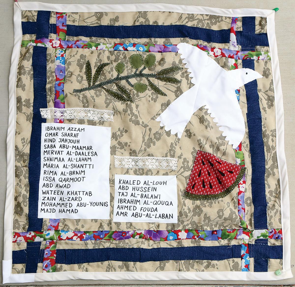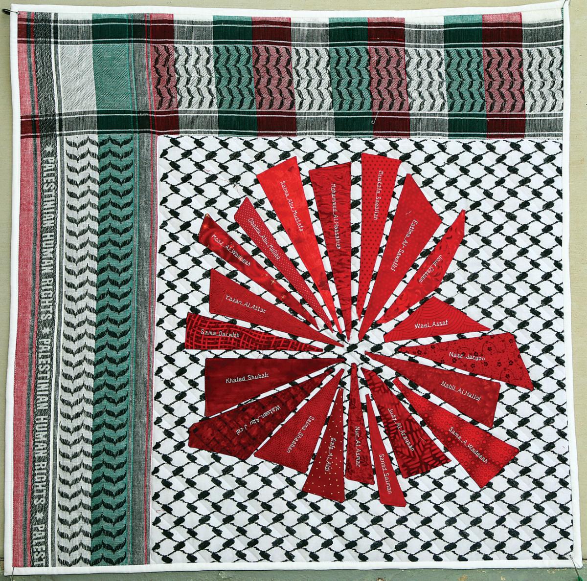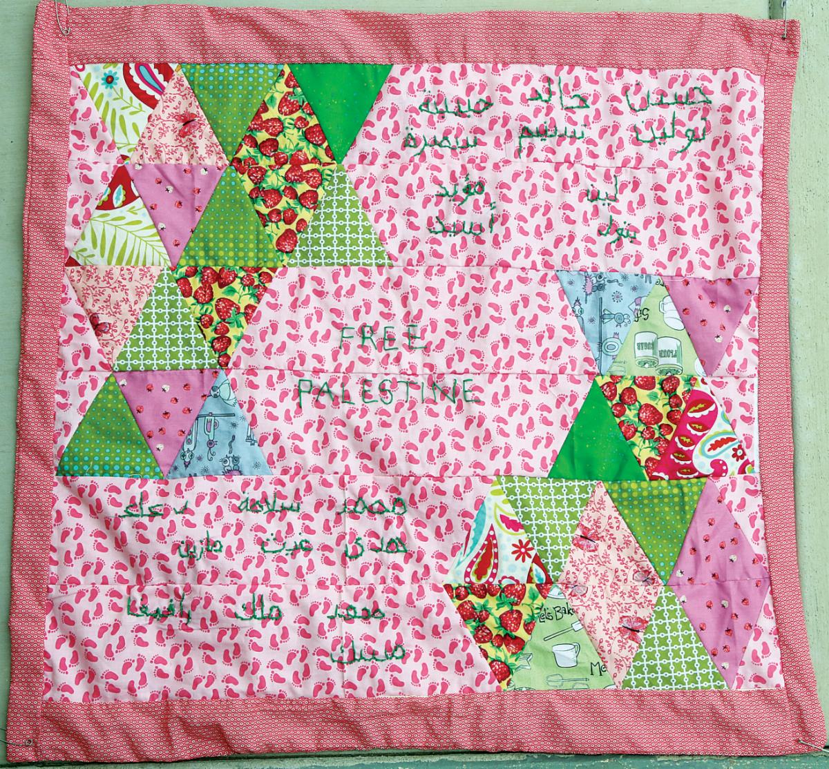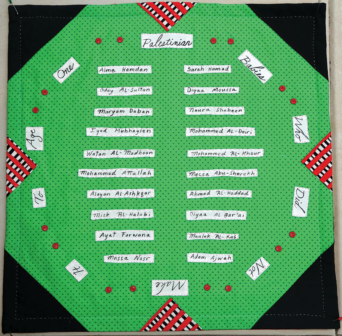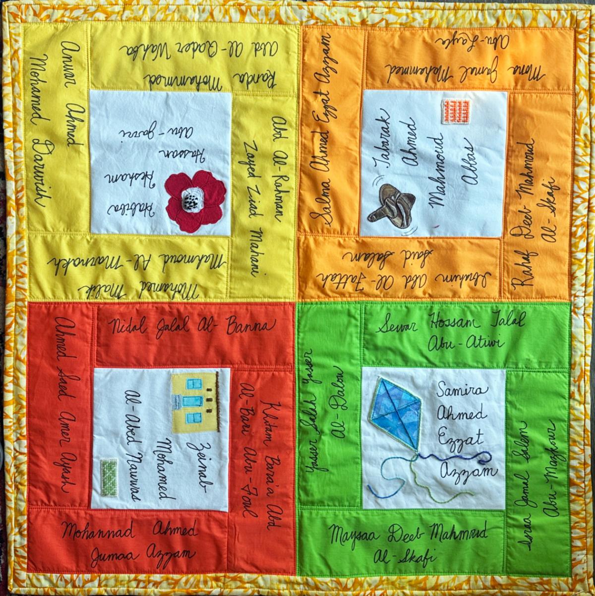 Janet Swann “My quilt portrays what a Palestinian baby’s life would have been filled with: love, home, safety, tatreez stitchery from a grandmother, handmade toys from a grandfather, a beautiful colorful world – and the heritage of the Palestinian people, represented by the national flower.“